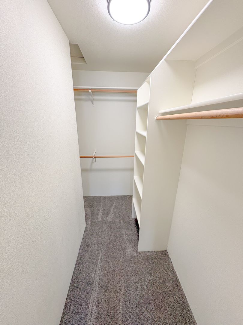 Primary bedroom has walk-in closet and access to main bathroom,