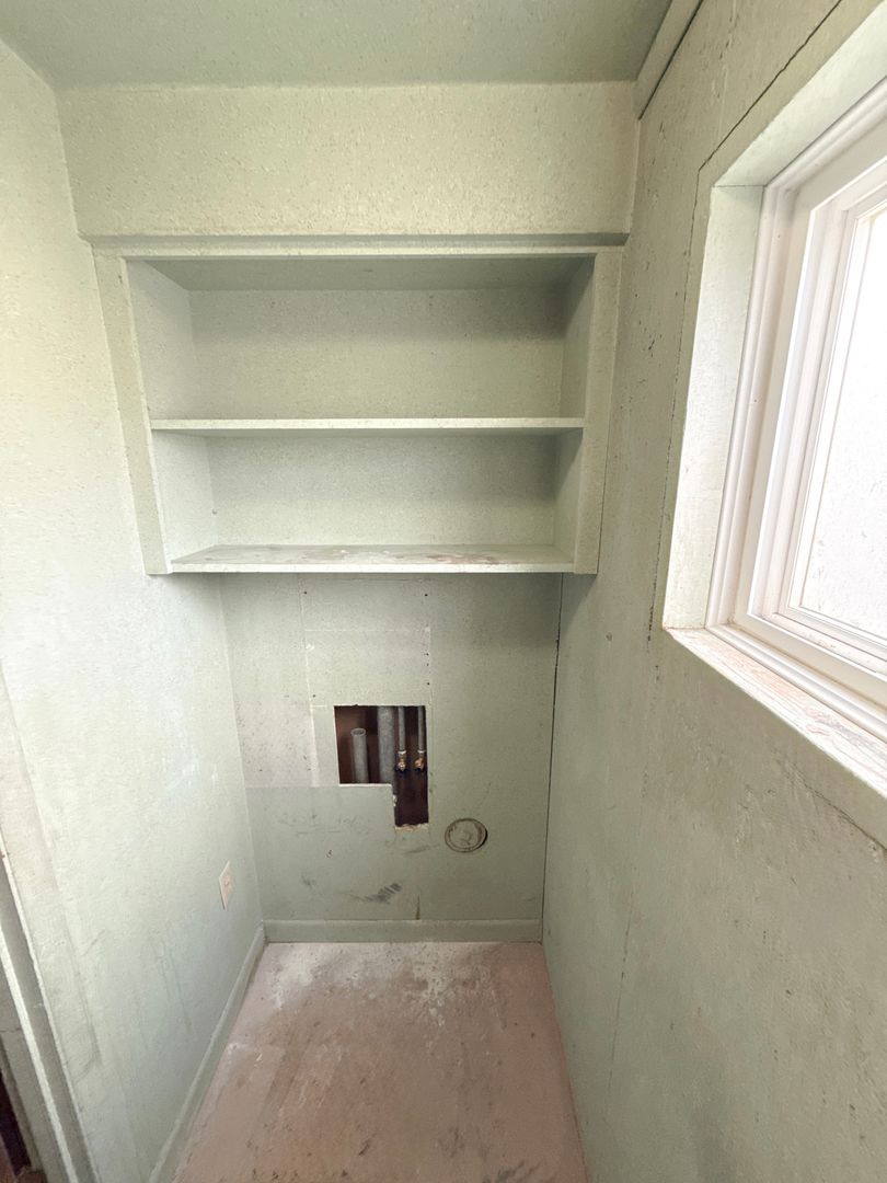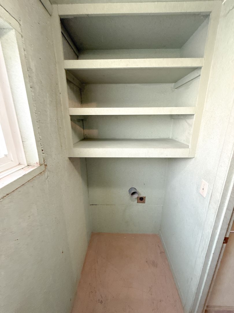 Laundry room, ½ bath in garage, Fireplace inoperable