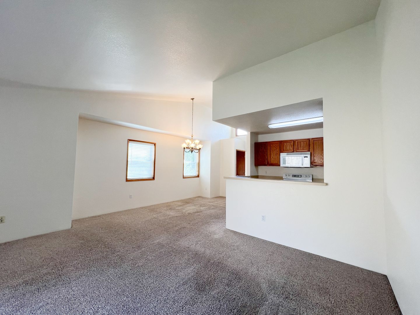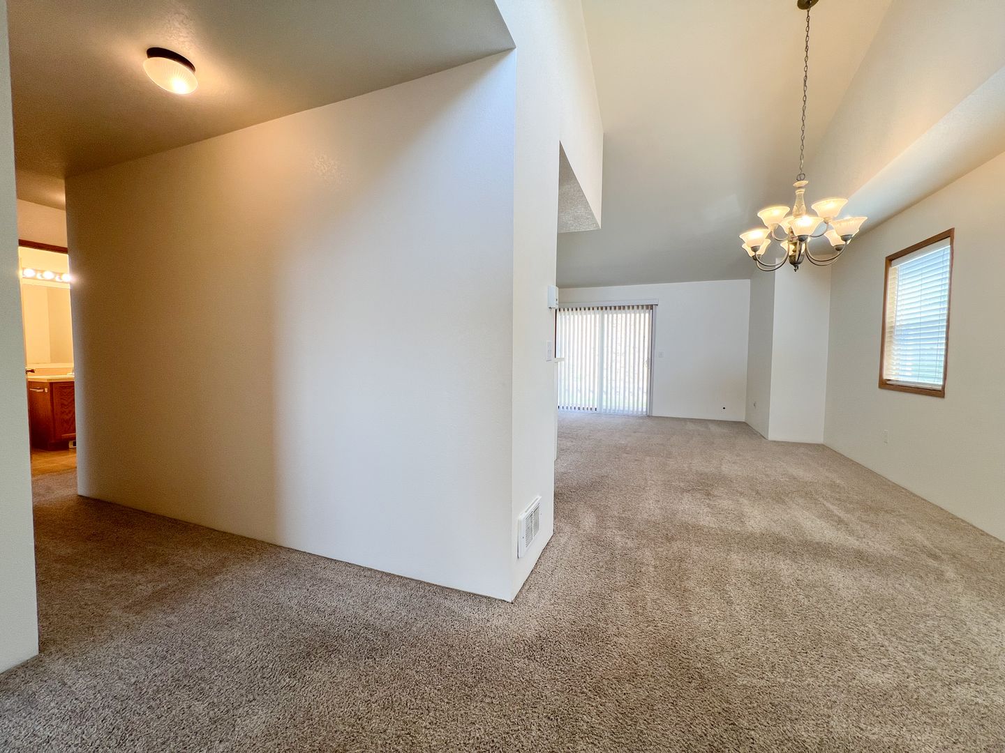 Vaulted ceilings, Large carpeted multi-use room.